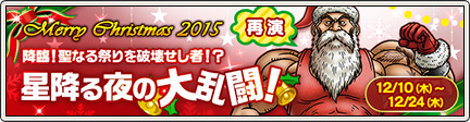 降臨! 聖なる祭りを破壊せし者!? 星降る夜の大乱闘! Topics 2015.12.102023.12.16 【再演】 降臨! 聖なる祭りを破壊せし者!? 星降る夜の大乱闘! (2015/12/25 更新) - ドラゴンクエストX - 目覚めし冒険者の広場アストルティアの各地で「赤い帽子のおじさん」が助けを求めているようです……!?※ 2015/12/25 イベント終了しました。詳しくは 『 こちら 』 をご覧ください。 ノエルブーツノエルハットノエルコート