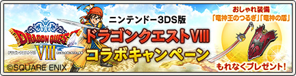 3DS版 『ドラゴンクエストVIII』 コラボキャンペーン! Topics 2015.08.272025.09.21 3DS版 『ドラゴンクエストVIII』 コラボキャンペーン! (2021/10/19 更新) - ドラゴンクエストX - 目覚めし冒険者の広場2015年8月27日に発売予定、ニンテンドー3DS 『ドラゴンクエストVIII 空と海と大地と呪われし姫君』 と 『ドラゴンクエストX』 のコラボキャンペーンを実施いたします。※ 2021/10/19 キャンペーン終了日を記載しました。詳し... 『竜神王のつるぎ』 『竜神の盾』